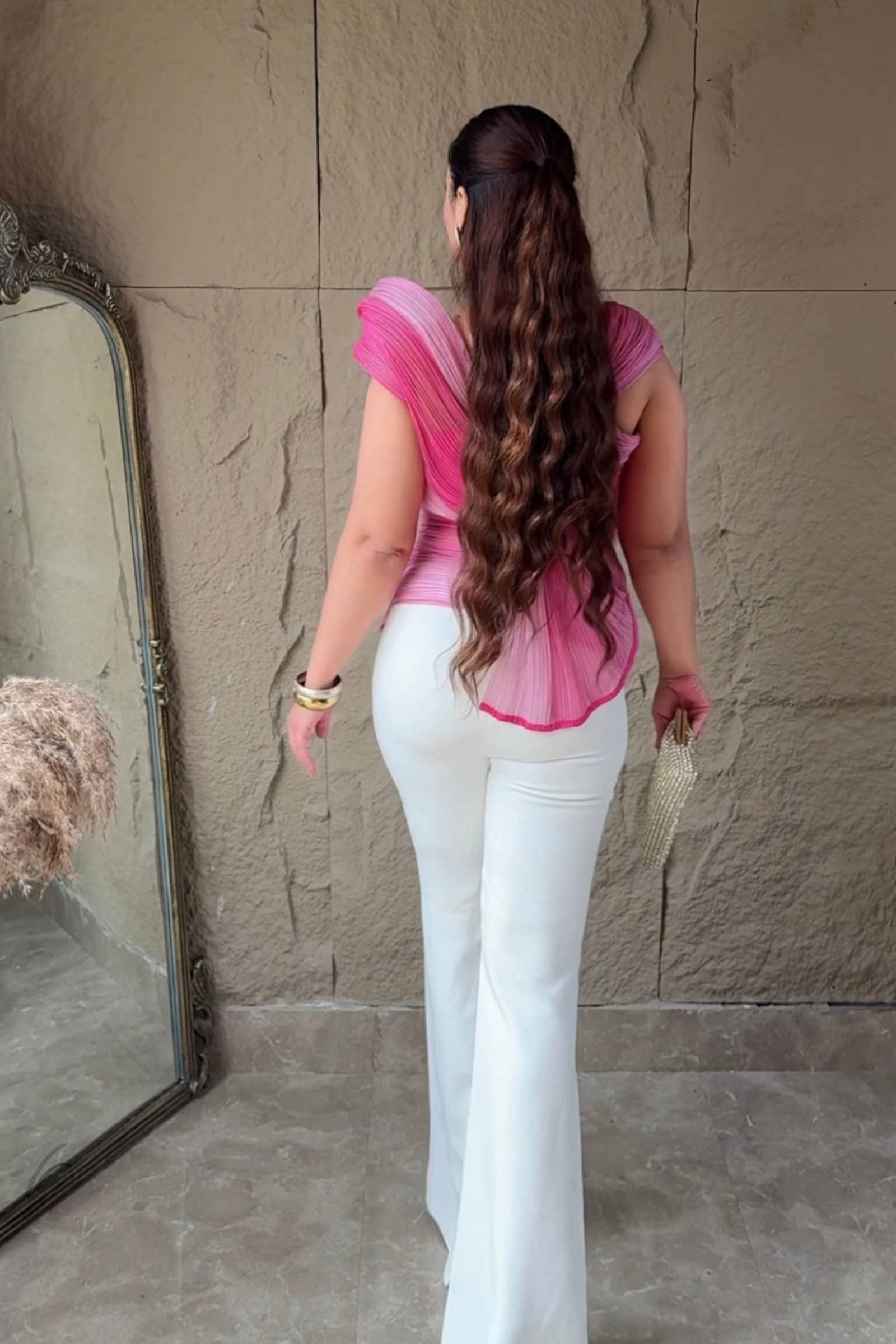 Elevate your wardrobe with the Berry Bliss Pant Set, featuring a statement wired sculpt top in a captivating ombré pink. Its intricate wiring and delicate pleating create a sculptural silhouette that flatters the body with fluid, architectural folds. The asymmetrical neckline and unique shoulder details add a modern couture touch. Perfectly paired with tailored trousers or a sleek skirt, this set offers a luxurious blend of boldness and femininity for any sophisticated occasion.