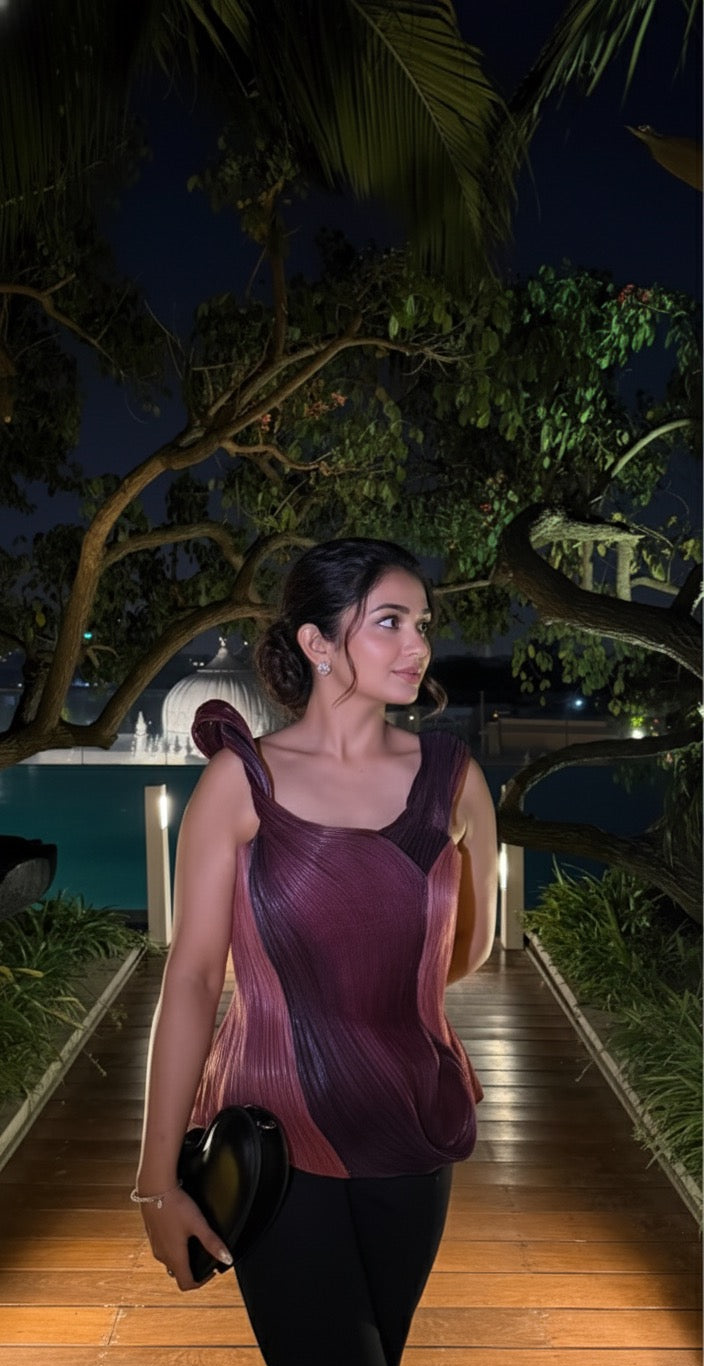 A sculpted masterpiece, this ombré berry-toned top flows like liquid art. Crafted with precision pleating, the structured silhouette hugs the body while creating dramatic movement through its fluid lines. The gradient blend of deep plum and rich raspberry shades adds depth, making it perfect for evening glamour or statement dressing.