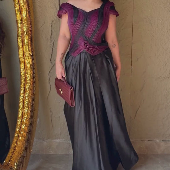 The Dreamy Knotted Dhoti Set epitomizes the fusion of refined elegance and graceful movement. This striking ensemble features a pleated purple and black top that shapes the upper body like a corset, paired seamlessly with a flowing dhoti-style skirt that drapes effortlessly, infusing your walk with both playful charm and commanding presence.