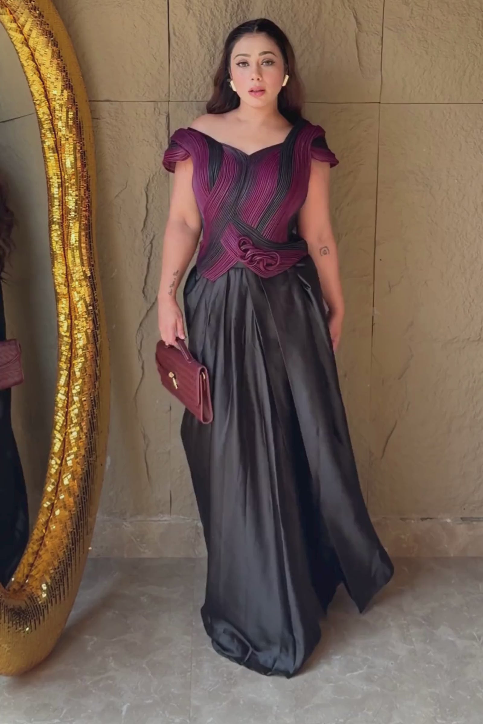 – Design Detail: Asymmetrical swirls and sculpted shoulder drapes