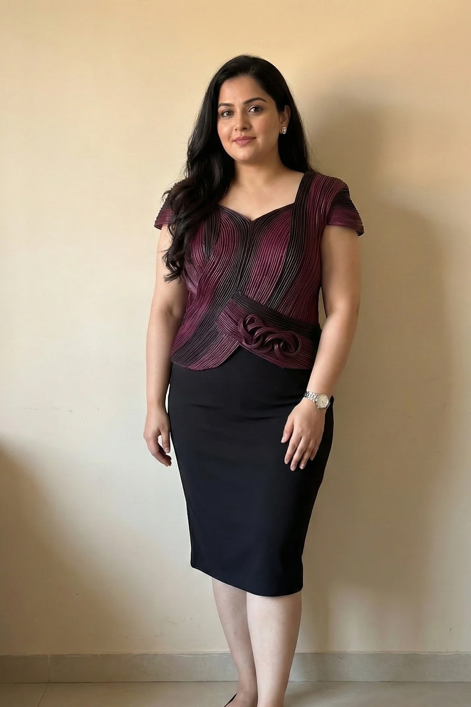 Rendered in sumptuous organza, this statement piece features an intricate interplay of purple and black in a bold monochromatic palette. The meticulously pleated construction molds the torso with corset-like precision, while asymmetrical swirls and sculptural shoulder drapes create an ethereal sense of motion. With its refined, body-contouring silhouette, this top is your ultimate companion for elegant evening affairs, intimate cocktail gatherings, and festive celebrations where only the most discerning style will suffice.