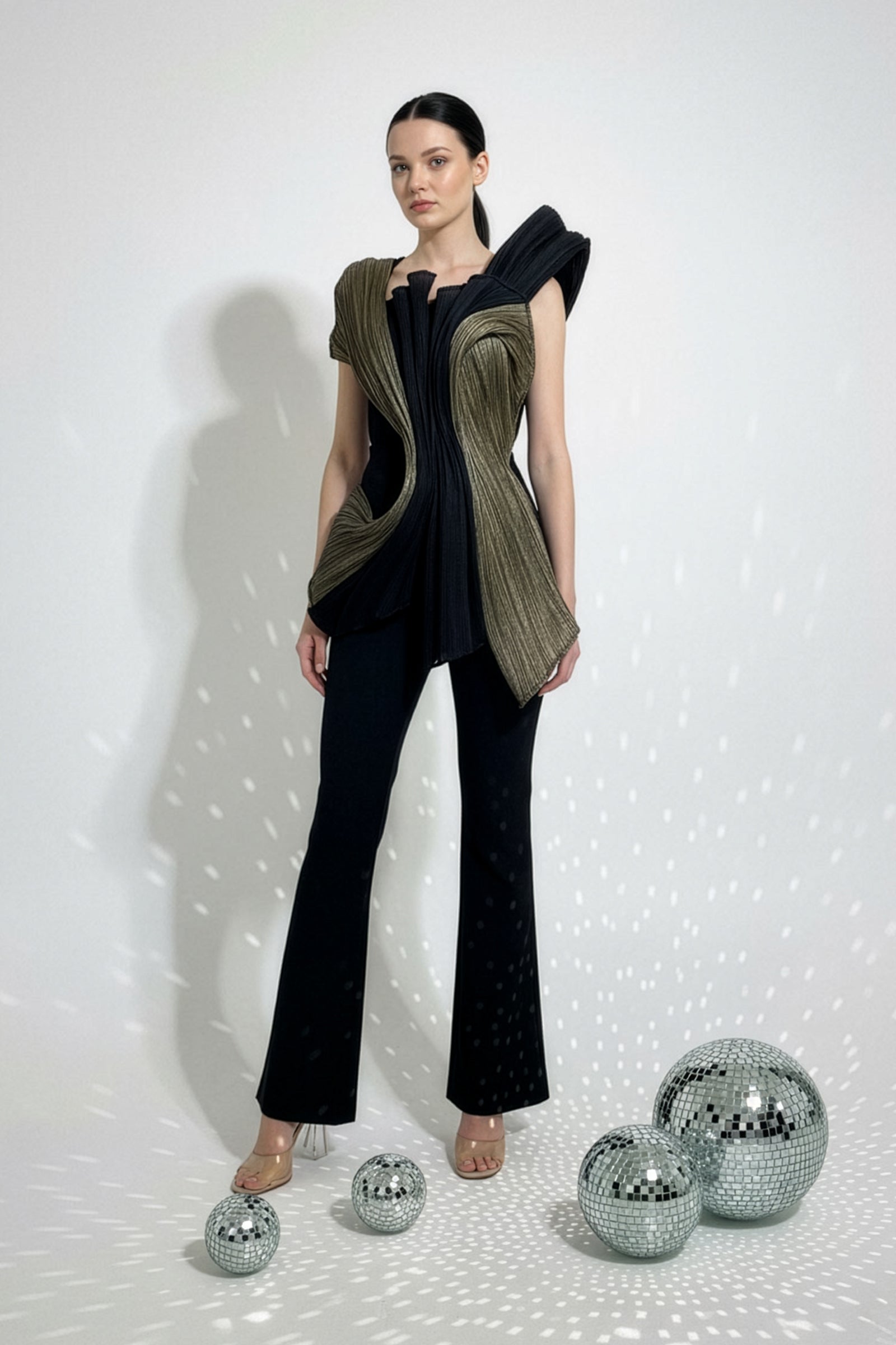 A striking black co-ord set featuring sculpted metallic pleated panels that create a bold, fluid silhouette. The asymmetric drape and structured design add instant drama—perfect for parties, events, and standout evenings.