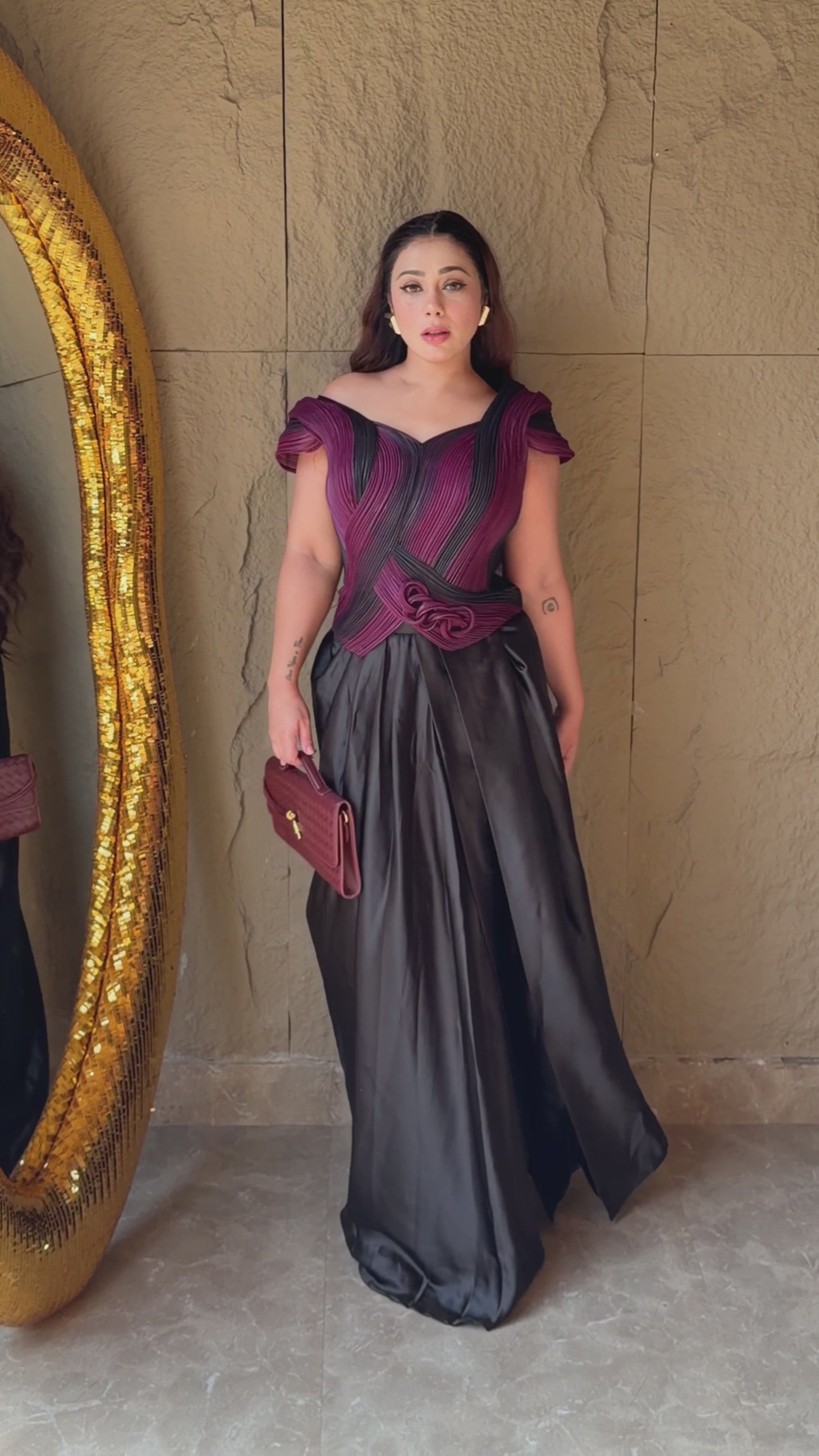 The Dreamy Knotted Dhoti Set epitomizes the fusion of refined elegance and graceful movement. This striking ensemble features a pleated purple and black top that shapes the upper body like a corset, paired seamlessly with a flowing dhoti-style skirt that drapes effortlessly, infusing your walk with both playful charm and commanding presence.