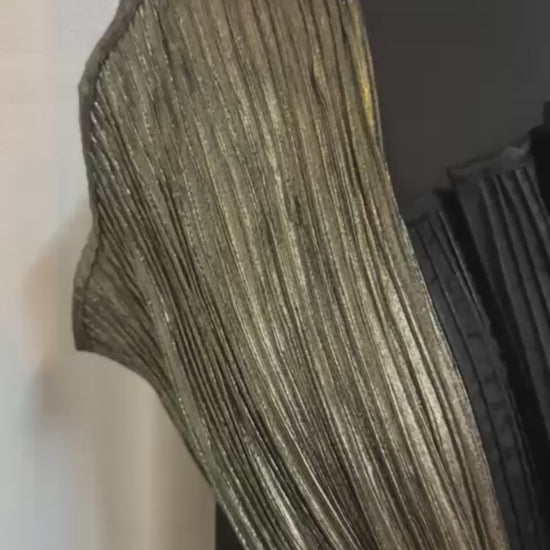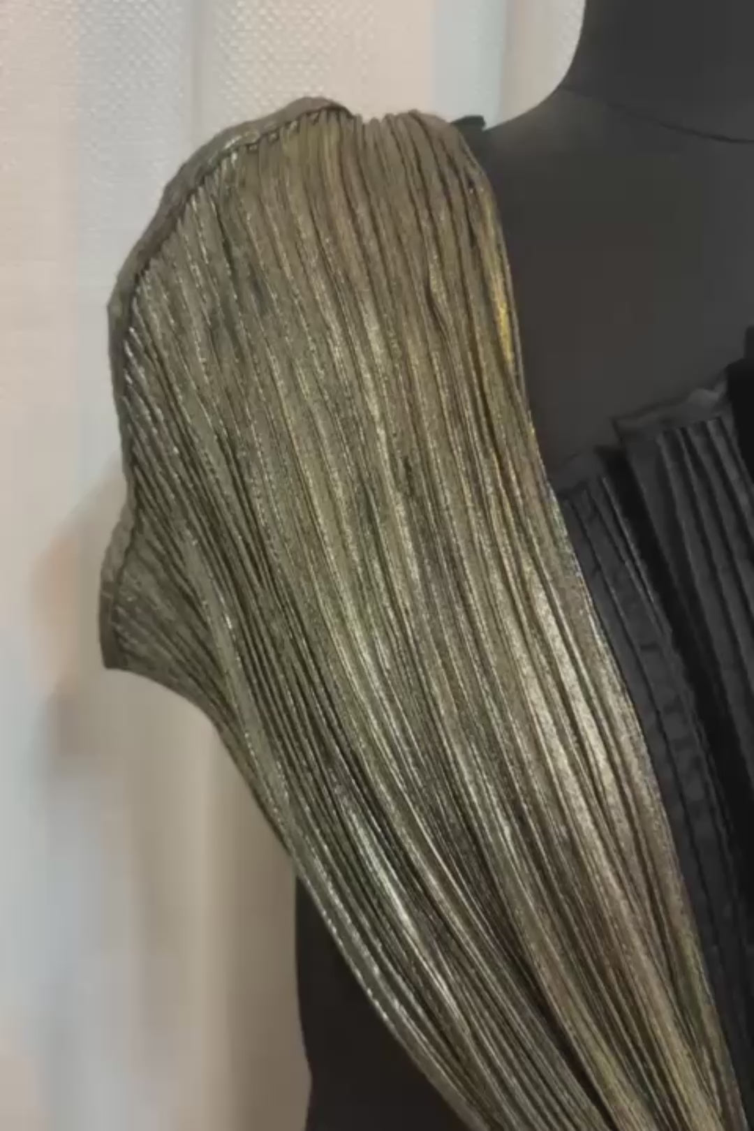 A dramatic sculptural top crafted with fluid, pleated panels in deep black and metallic plum. The design flows in bold, wave-like formations that wrap around the body, creating a powerful 3D silhouette. The pleated textures shimmer beautifully under light, giving the piece a futuristic, couture-inspired energy. Asymmetric in form and artfully structured with wire technique, this top is a true statement—perfect for editorial shoots, runway moments, and high-impact styling.