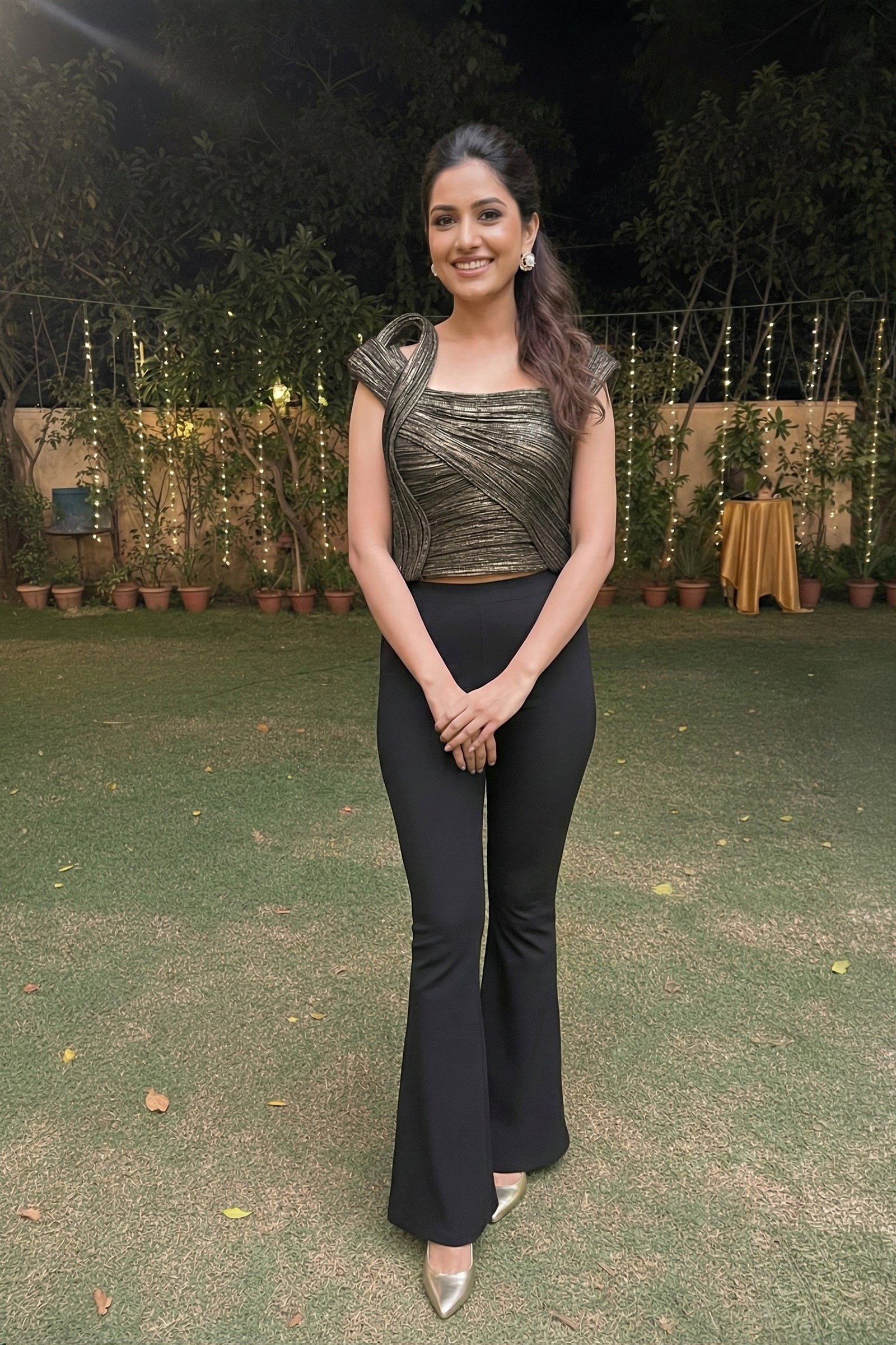 Elevate your evening style with this sculpted metallic top, designed to make an effortless statement. Crafted in a luxe shimmer fabric, it features a beautifully structured neckline with an asymmetric swirl detail that adds dimension and elegance. The fitted silhouette enhances your shape while keeping the look modern and polished. Perfect for cocktail nights, festive dinners, or any occasion where you want to shine with subtle sophistication.