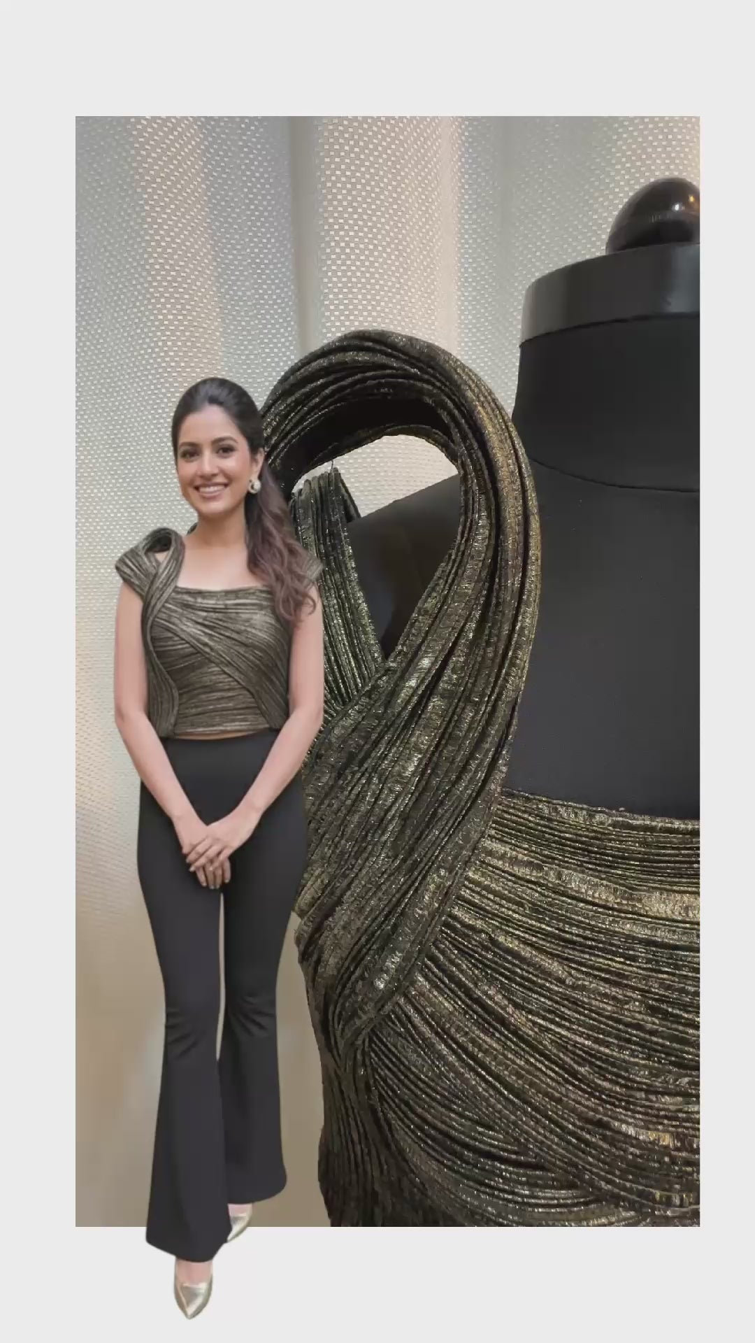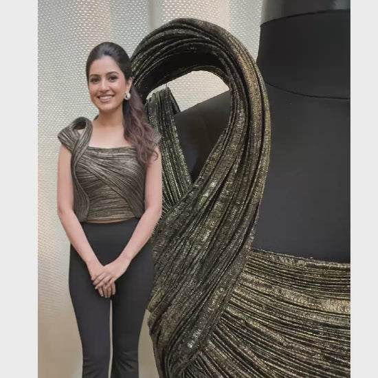 – Fabric: Organza with metallic pleated detailing